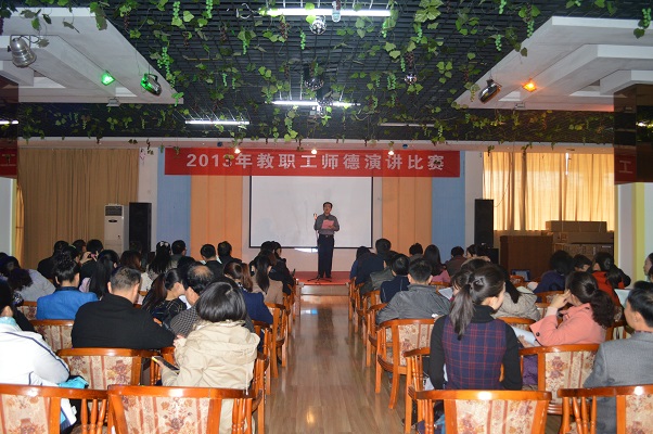 (本网讯) 123下午,由校工会主办的第八届教职工师德演讲比赛在校本部教职工活动中心举行。本次比赛以“学《规范》、强师风、树师德、铸师魂”为主题,来自各分工会的22名选手参加了比赛,校纪委书记、工会主席杨斌及全校工会干部、教师代表共80多人在现场观看比赛。