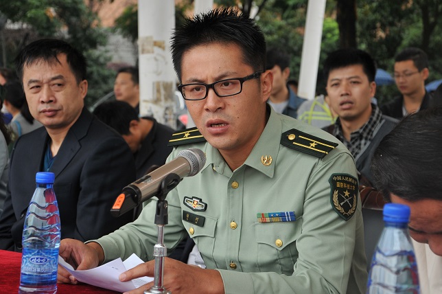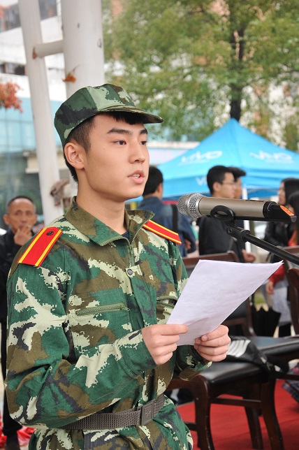 徐珂少校代表承训单位讲话,他希望同学们树立吃苦精神,严格服从管理,增强国防意识;希望各位教官能够以身作则、严守军纪、严格要求、科学施训、坚决完成各项任务。