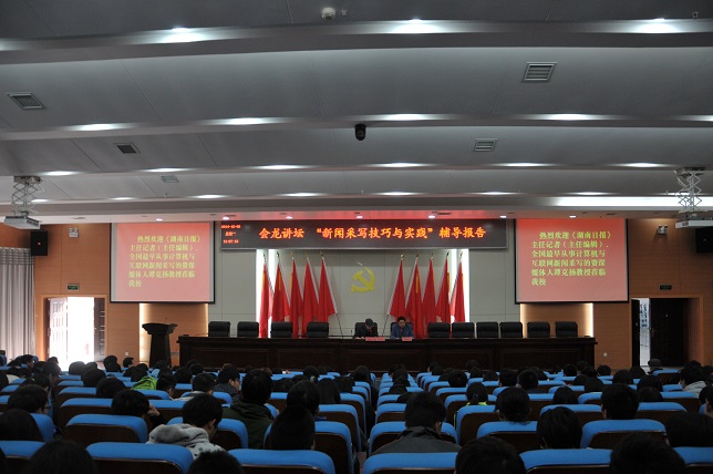 (本网讯)新闻写作要怎样才能突出“正能量”?凡人小事是否也能挖掘出大新闻? 12 2 下午,会龙讲坛第14讲在图书馆报告厅举行。湖南日报主任记者谭克扬以近20年新闻报道的亲身经历,与我校教职工通讯员、学生记者、团学会学生干部300余人分享了“新闻采写技巧和实践”。讲坛由统战部和科技处主办、学校团委协办。