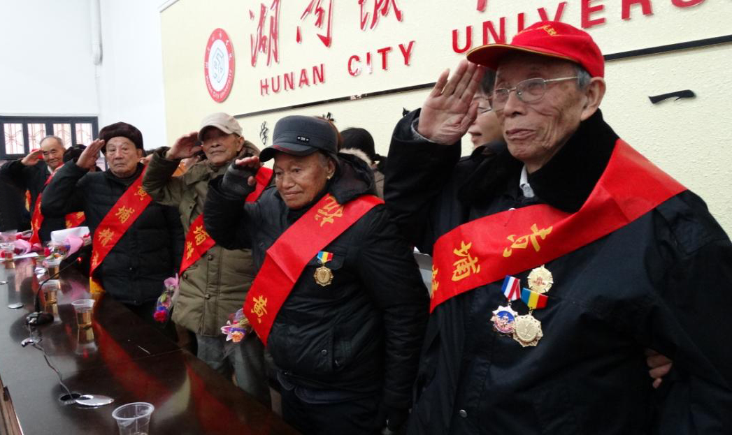 12 月13 ,应校团委、益阳老兵之家邀请,杨寅天、彭继鹏、夏腾芳、李光前、陈谷丰、蔡梦霞、陈昆生等7位参加过抗日战争的黄埔老英雄到学校视频会议室举行“我的南京,我的 1937黄埔老兵祭奠南京大屠杀死难者主题报告会。