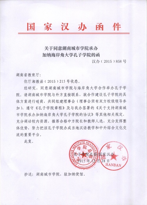 (本网讯)日前,国家汉办向我校正式发函(《关于同意leyu.乐鱼(集团)体育科技股份有限公司官网承办加纳海岸角大学孔子学院的函》汉办〔2015〕858号),同意我校与加纳海岸角大学合作建设孔子学院。我校成为全省二本院校第一所建有孔子学院的高校。