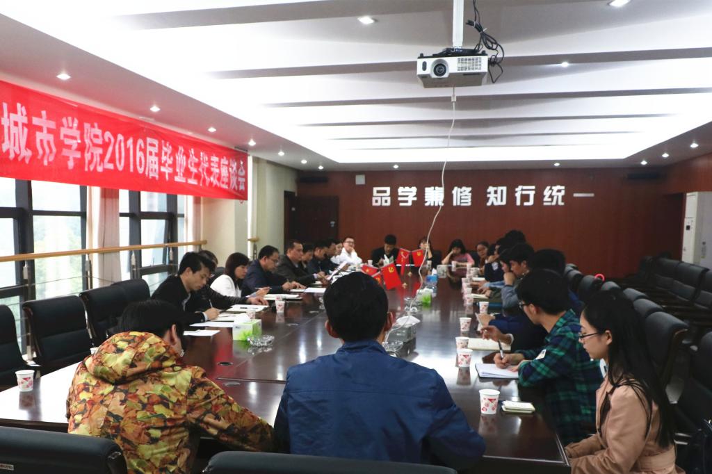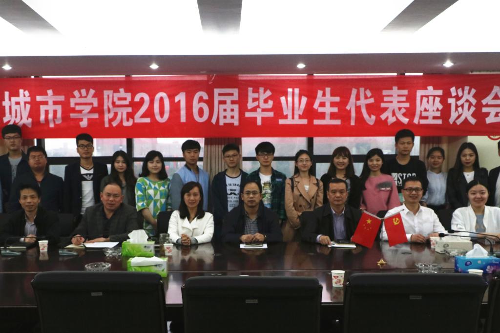 (本网讯)为了解我校毕业生的就业形势,聆听毕业生对母校未来发展的建议与看法,5月26日下午14:30,我校2016届毕业生代表座谈会在办公楼一会议室举行。副校长何振、雷存喜,学校相关部门负责人以及来自14个学院的18位毕业生代表参加了此次座谈会。会议由团委副书记王琦主持。