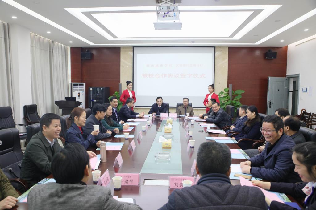 (本网讯)2017年3月30日上午,我校与交通银行益阳分行在规划建筑设计研究院会议室举行银校合作协议签字仪式。校长李建奇,副校长刘辉煌、雷存喜,交通银行益阳分行行长肖文锦、副行长周兴出席。签字仪式由刘辉煌主持。