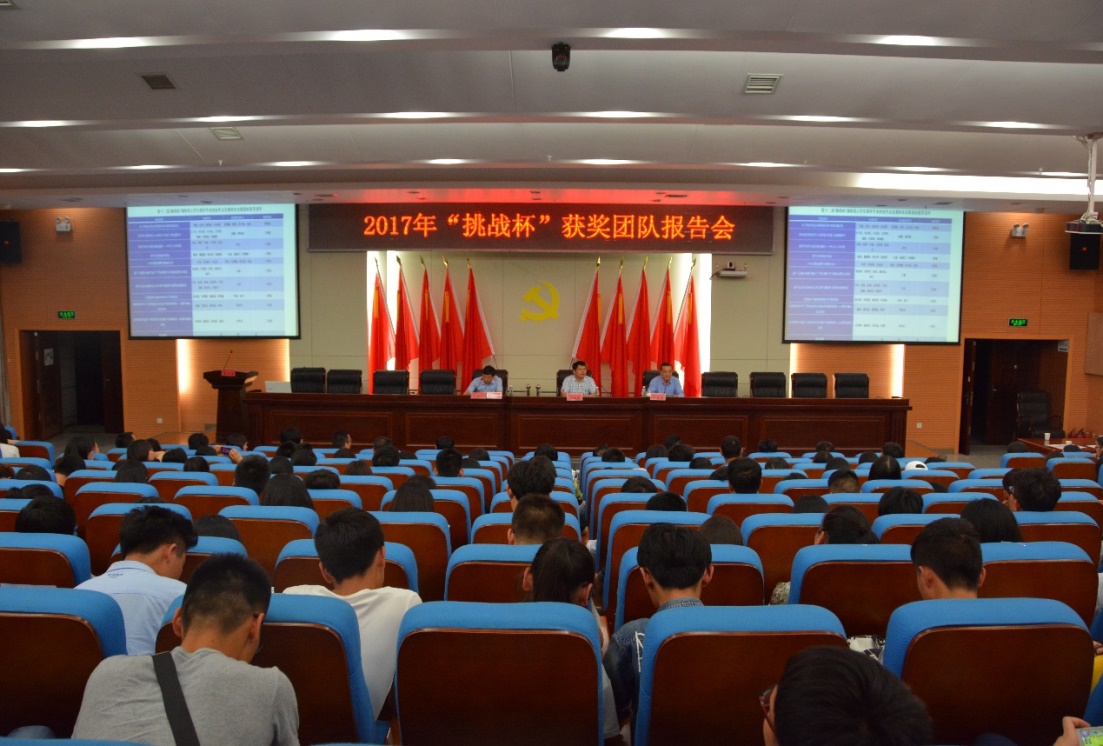 (本网讯)5月25日晚,学校在图书馆报告厅召开了2017年“挑战杯”获奖团队报告会。党委书记罗成翼,副校长雷存喜、谭献良出席会议,团委、创新创业学院全体人员,教务处、学生处负责人,各二级学院分管教学工作副院长、副书记、团总支书记,2017年“挑战杯”参赛团队指导老师与学生,大一大二各团支部团支书,研究性学习和创新性实验项目团队学生代表以及创新创业社团学生代表参加会议。