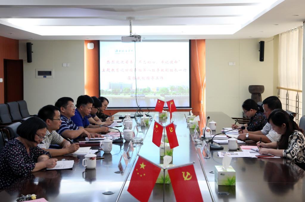 (本网讯)2019年9月17日,省委“不忘初心、牢记使命”主题教育巡回指导组第八组副组长李驰,组员蒋瑛、彭辉来校指导“不忘初心、牢记使命”主题教育活动开展。党委书记罗成翼、党委副书记汤放华、党委委员袁志成以及党政办、组织部、宣传部相关负责人参加了指导会。