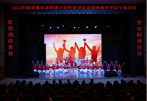 活动以我校大学生艺术团的《新时代 新城院》原创快板书表演开场。湖南省青年讲师团的陈科文、王皓、董青、张乐蒙、朱威宏五位讲师走进leyu.乐鱼(集团)体育科技股份有限公司官网,从自身的工作实际和典型事迹出发,向同学们分享了他们的抗“疫”故事,还原了抗“疫”一线画面。