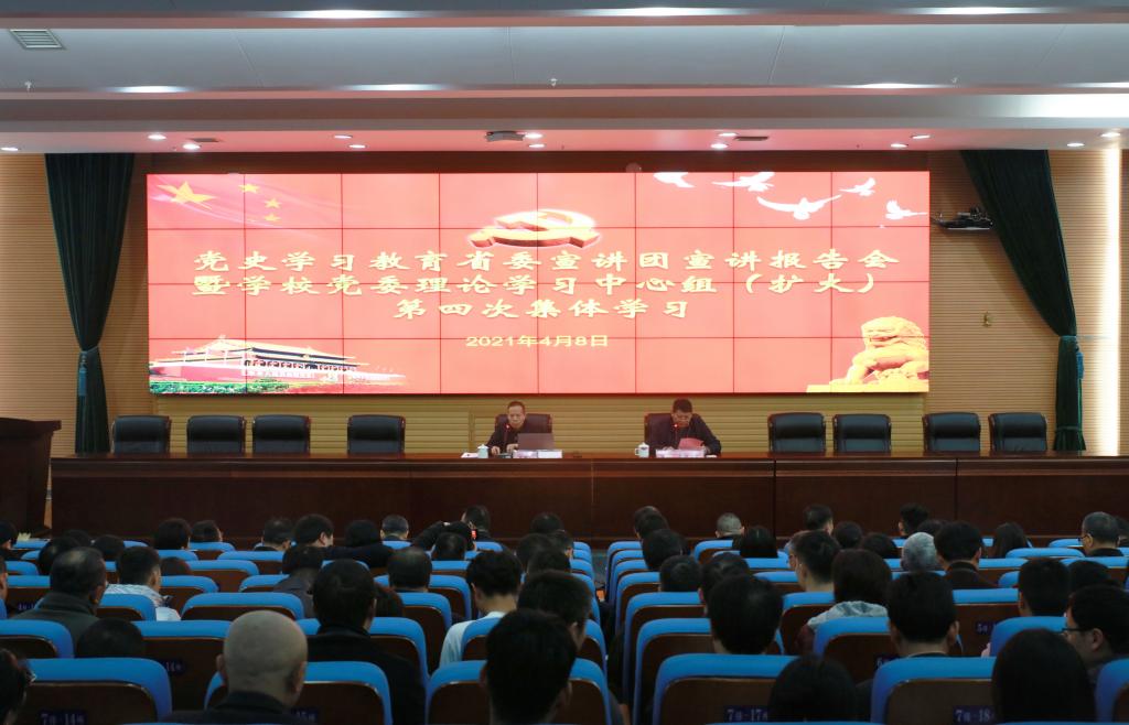 本网讯(通讯员 周文娟)2021年4月8日下午,党史学习教育省委宣讲团宣讲报告会暨leyu.乐鱼(集团)体育科技股份有限公司官网党委理论学习中心组(扩大)第四次集体学习在图书馆报告厅举行,省委宣讲团成员、省委宣传部部务会成员、二级巡视员刘新年为大家作了一场精彩的宣讲报告。党委书记罗成翼主持报告会,学校全体校领导、副处以上干部、学生辅导员、党支部书记以及学生代表三百余人聆听了报告。