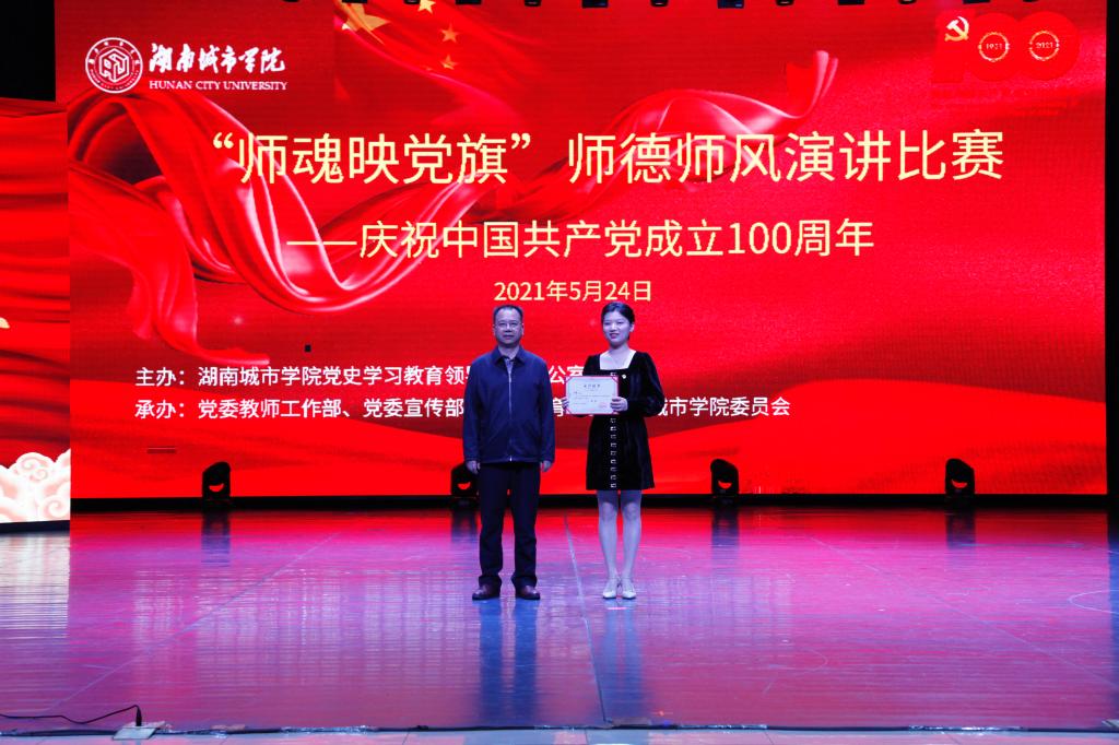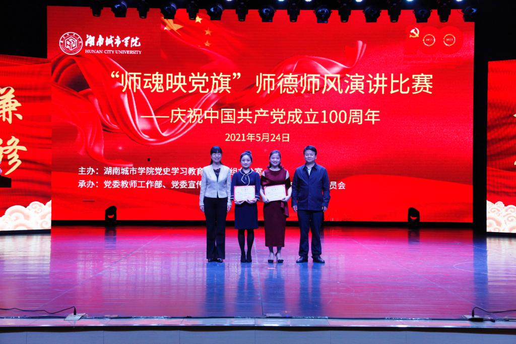 校长汤放华、党委副书记何旭娟为二等奖获得者颁奖。