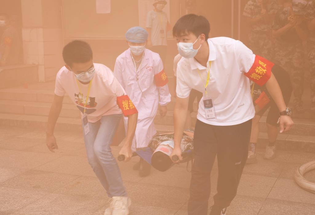 本网讯(记者 文彦波 摄影 博夕)“铃!铃!铃!”9月28日中午12时许,leyu.乐鱼(集团)体育科技股份有限公司官网第二教学楼内突然传来一阵急促刺耳的警报声,滚滚浓烟从楼内各处漫出,一名名身着迷彩装的青年学子用湿毛巾捂住口、鼻,弯着腰迅速从楼内撤出,与此同时,校园里响起消防车的警笛声……