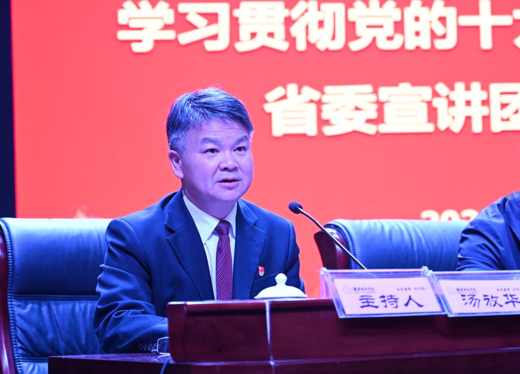 龚政文重点围绕党的十九届六中全会审议通过的《中共中央关于党的百年奋斗重大成就和历史经验的决议》(以下简称《决议》),运用丰富的史实、生动的案例,深入分析了《决议》的重大历史意义、现实意义,全面解读了《决议》的脉络、架构、特点和主要内容,系统阐述了从党的百年奋斗历程中汲取智慧和力量等内容。同时龚政文还传达了省第十二次党代会的主要精神。