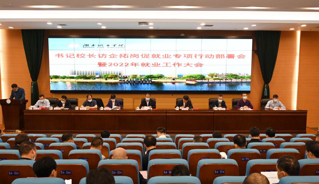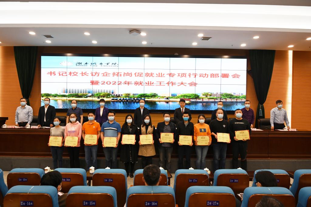 本网讯(供稿:招生就业处)为全面贯彻落实党中央、国务院关于高校毕业生就业工作决策部署,千方百计为毕业生开拓更多就业岗位和机会,深入落实就业工作“一把手”工程,2022年4月22日上午,我校在图书馆报告厅召开书记校长访企拓岗促就业专项行动部署会暨2022年就业工作大会,总结上年度就业工作,表彰先进集体和先进个人,研究部署书记校长访企拓岗专项行动。