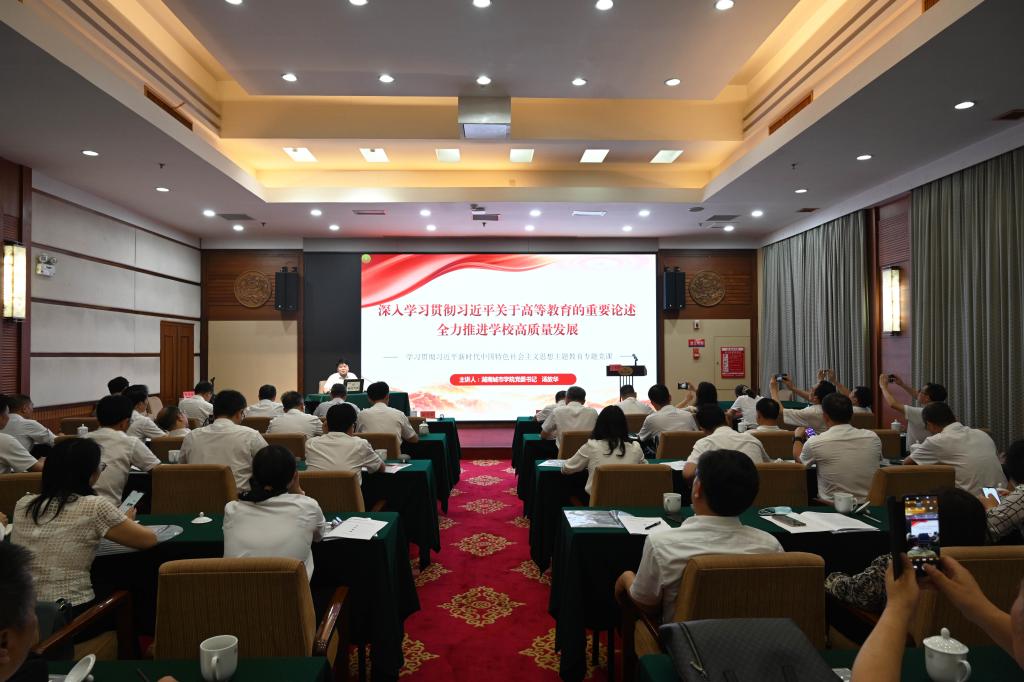 下午,全体成员在韶山宾馆会议室进行了“以学增智”专题学习研讨。汤放华以《深入学习贯彻习近平关于高等教育的重要论述 全力推进学校高质量发展》为题,为大家上了一堂深刻的党课。汤放华紧密结合当前高等教育新形势和学校发展新情况,通过详实的数据对比、丰富的案例讲解,从领会精神、再学习再思考习近平总书记关于教育重要论述,审时度势、切实增强教育强国的责任感使命感和紧迫感,狠抓落实、谱写新时代新征程leyu.乐鱼(集团)体育科技股份有限公司官网高质量发展新篇章三个方面,阐述了学习贯彻习近平总书记关于教育的重要论述我们要做什么、怎么做的问题。
