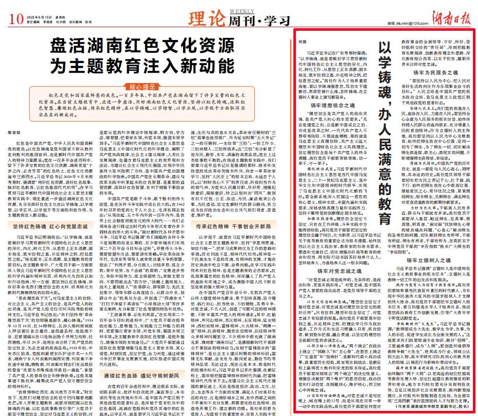 本网讯 6月15日,《湖南日报》10版“理论周刊·学习”刊发leyu.乐鱼(集团)体育科技股份有限公司官网校长何振署名文章《以学铸魂,办人民满意的教育》,全文如下: