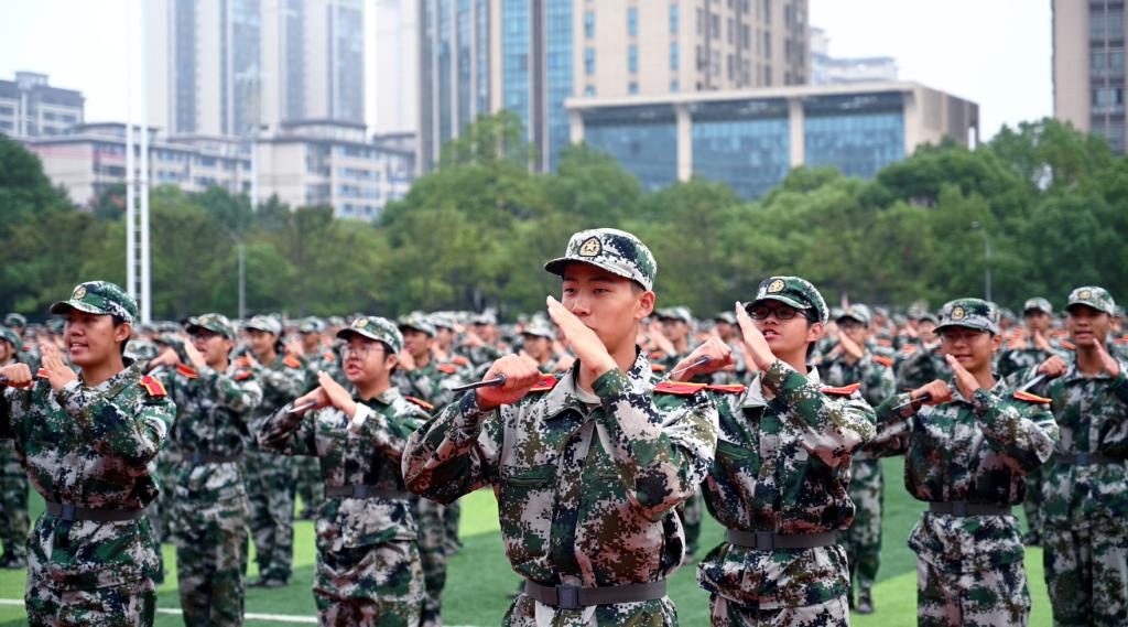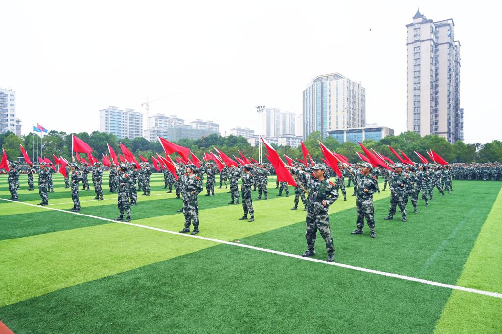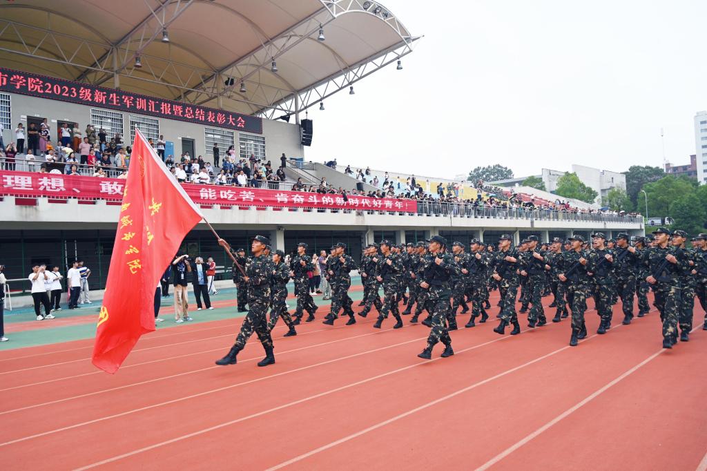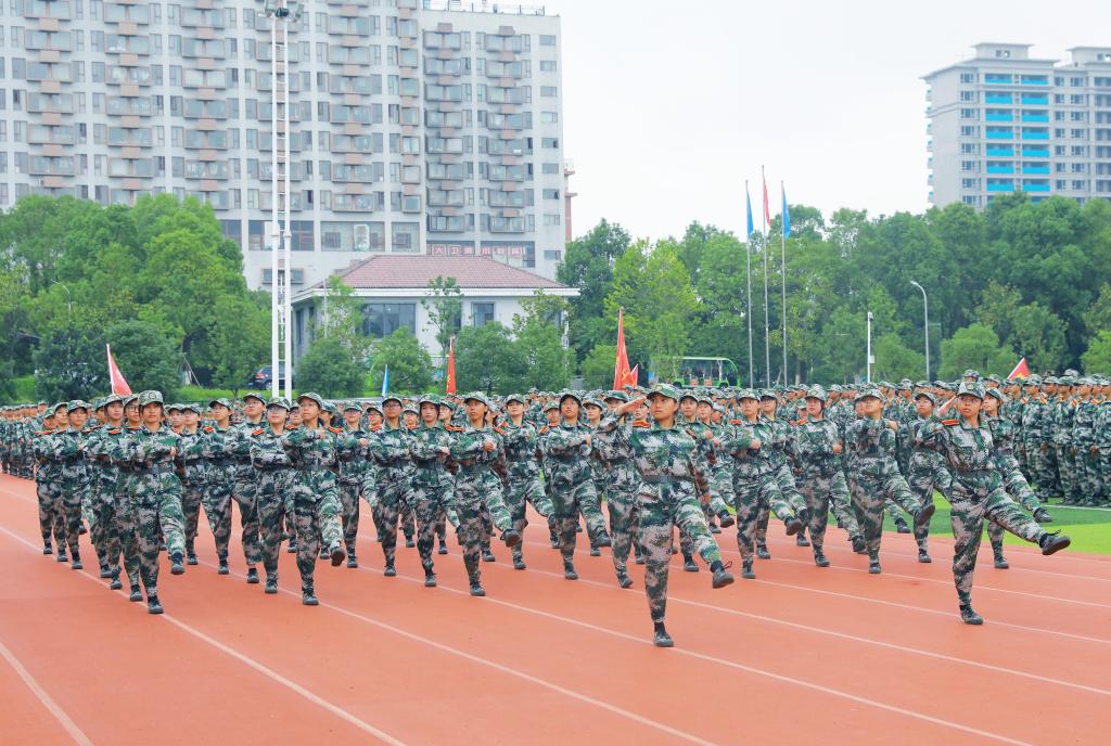 分列式进行曲响彻全场,教官分队持枪入场,眼神坚毅。他们以豪迈的激情斗志、过硬的军事素养向全校师生展现昂扬奋发、勇敢坚毅的精神风貌和青春风采。十三个二级学院方阵紧随其后,身着戎装的新生喊着铿锵有力的口号,迈着整齐矫健的步伐,向全校师生展示军训成果,接受全场的检阅。