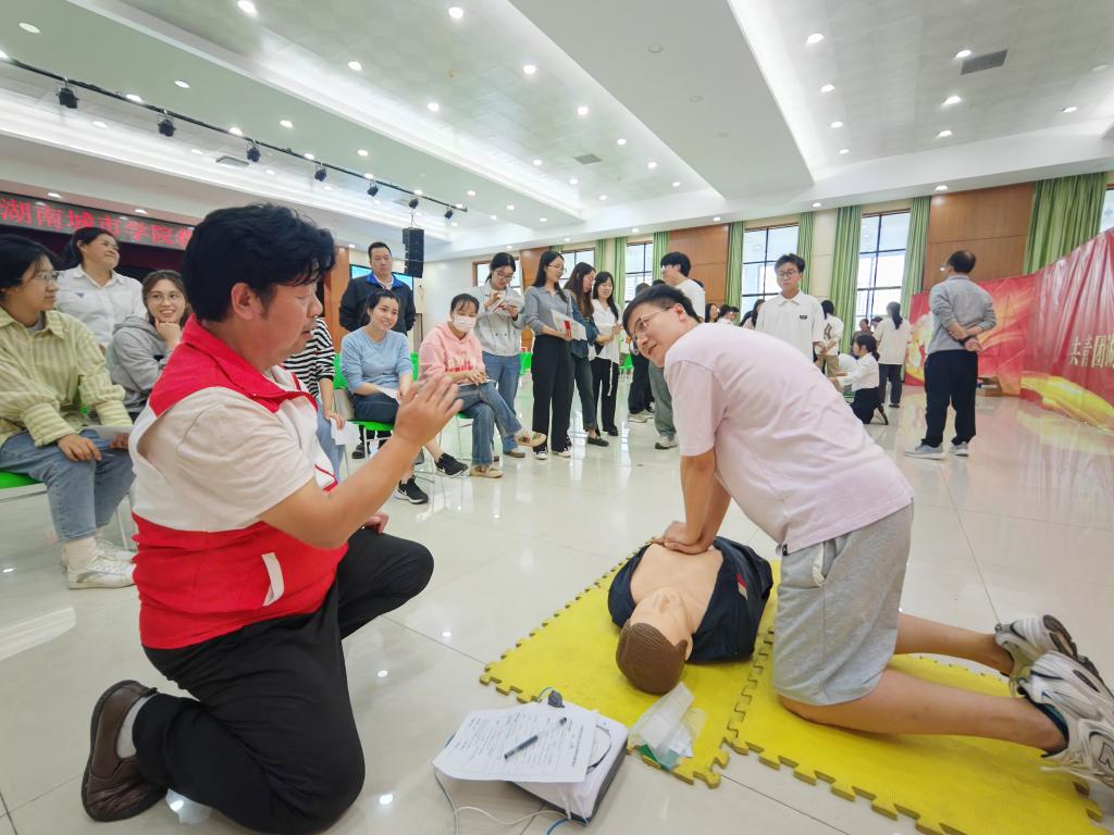 本网讯(通讯员 孔军)正确的心肺复苏术实施步骤需要30次按压、2次人工呼吸交替进行,并保持每分钟100至120的频次和每次5至6厘米的按压深度……10月24日,在学校学生活动中心,我校80余名师生现场接受了益阳市红十字会紧急急救培训和心脏除颤仪(AED)使用培训。