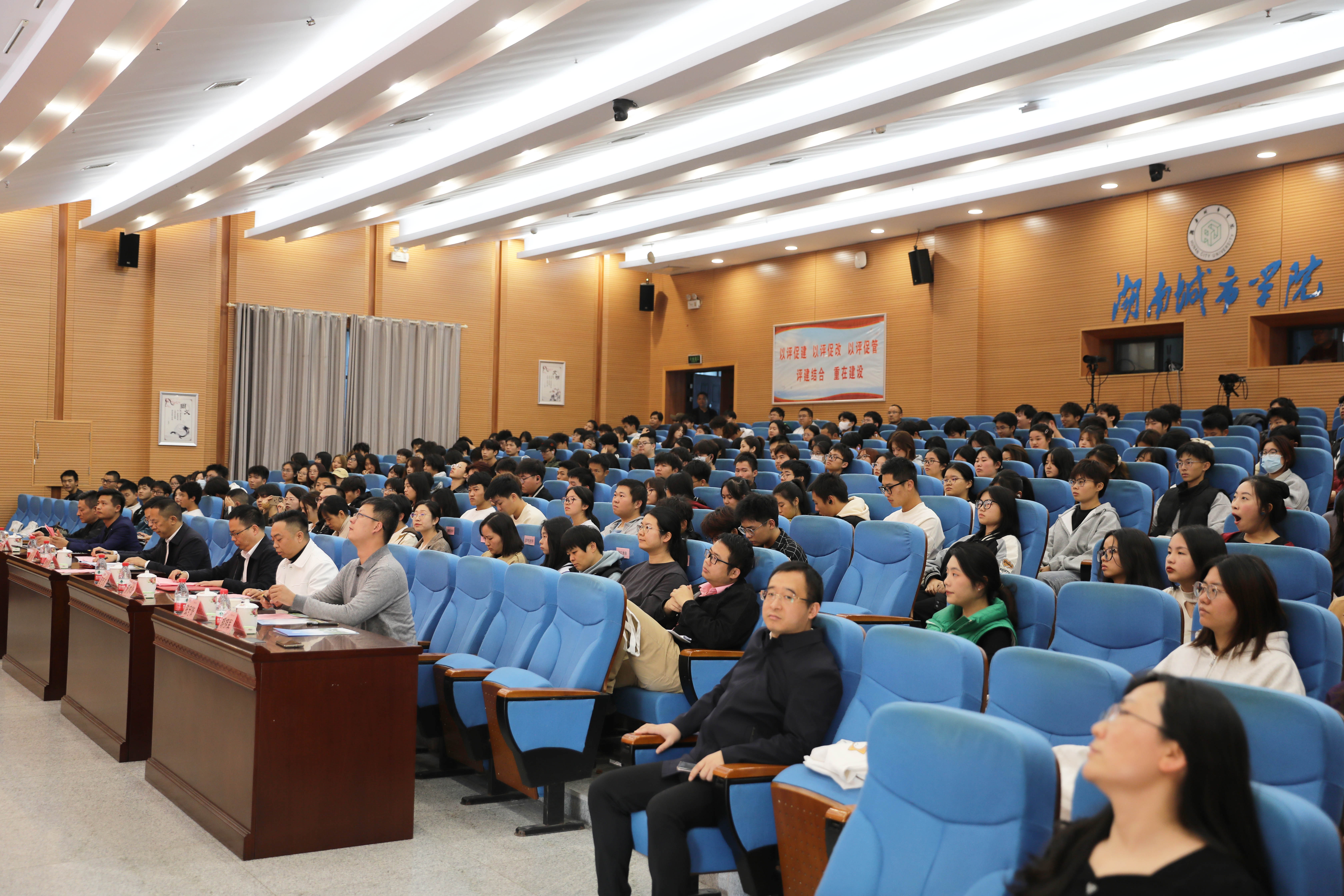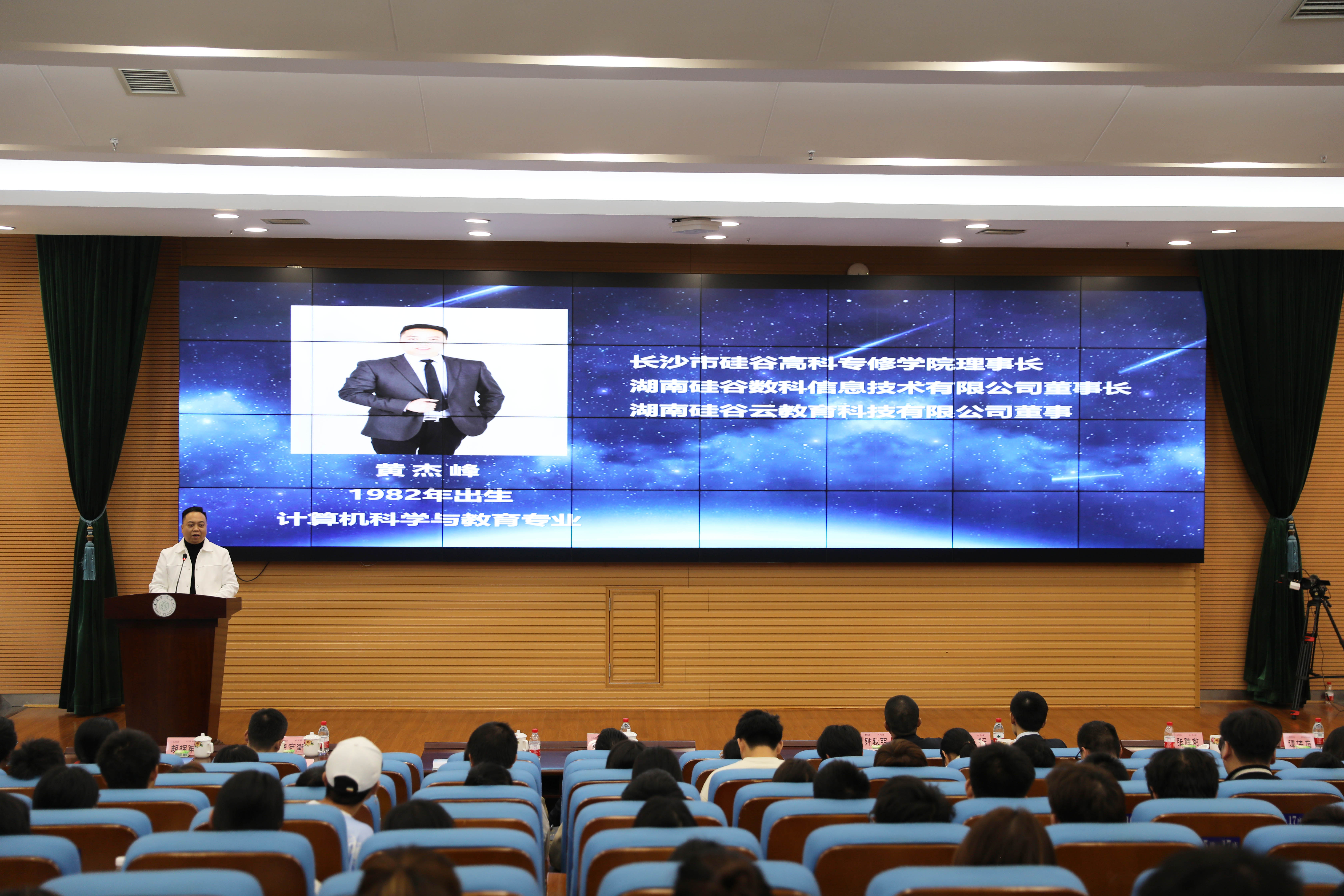 袁志成致欢迎辞,他代表学校对莅临本次活动的来宾表示热烈欢迎,并介绍了学校近年来开展的扎实有效的改革实践以及取得的成果。他表示,希望同学们在本次活动中以企业家为榜样,树立个人崇高理想,汲取积极向上的力量,为加快实现湖南省“三高四新”美好蓝图贡献个人力量。