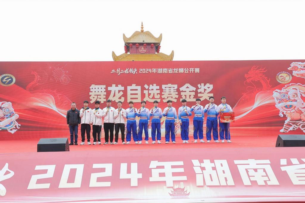 本网讯(通讯员 郭羽)天上飞龙、地上舞龙、水上龙竞,三龙齐聚,春回大地。3月9日,由湖南省龙狮运动协会主办的“二月二 龙抬头”2024年湖南省舞龙舞狮公开赛在岳阳举行。经过激烈角逐,我校舞龙代表队不畏强敌、顽强拼搏,一举夺得舞龙自选套路金牌