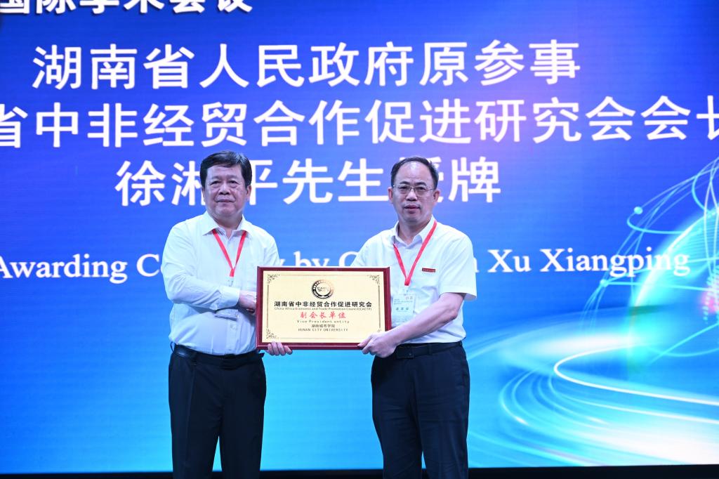 湖南省中非经贸合作促进研究会会长徐湘平为我校授牌。