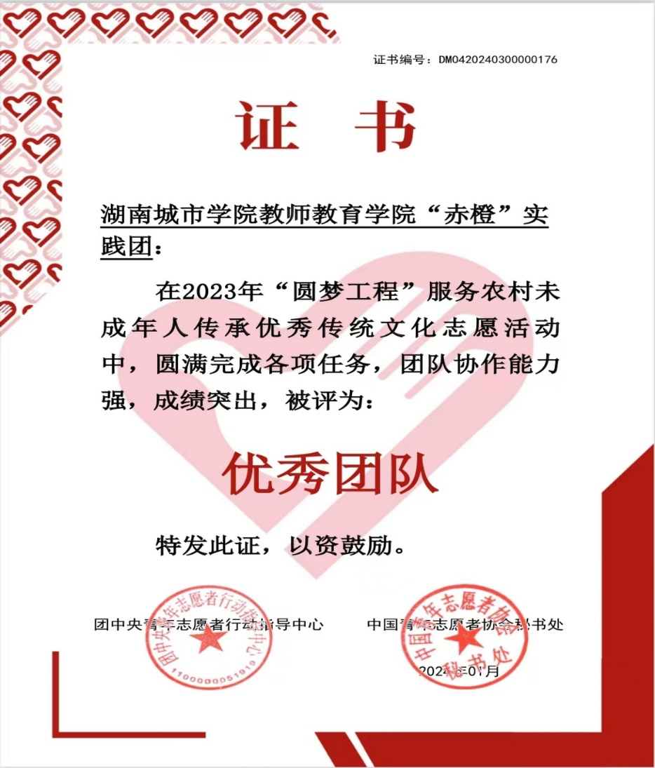 本网讯(通讯员 刘爽近日,由团中央青年志愿者行动指导中心牵头主办的2023年各类志愿服务活动优秀团队名单陆续公布,教师教育学院“赤橙”实践团荣获团中央“圆梦工程”志愿服务“优秀团队”。