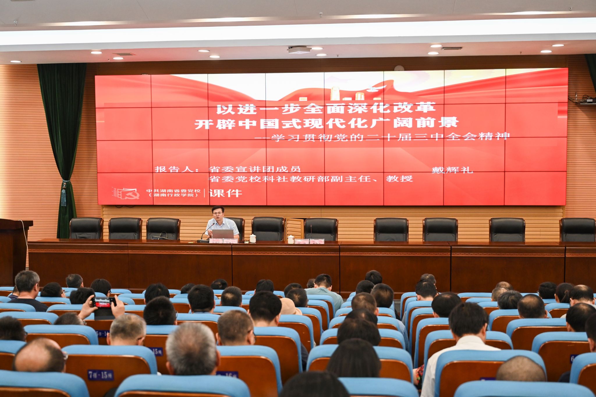 本网讯(通讯员 周文娟)9月26日下午,我校在图书馆报告厅举行学习贯彻党的二十届三中全会精神宣讲报告会暨学校党委理论学习中心组2024年第十一次(扩大)集体学习。省委宣讲团成员、省委党校科学社会主义教研部副主任戴辉礼教授做专题宣讲,会议由校党委副书记、校长何振主持。