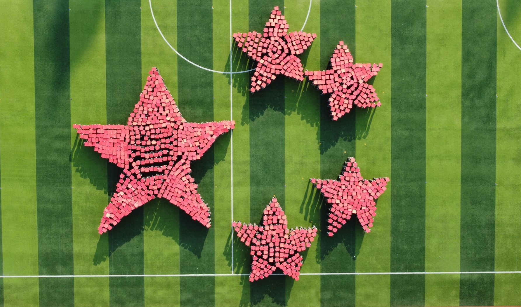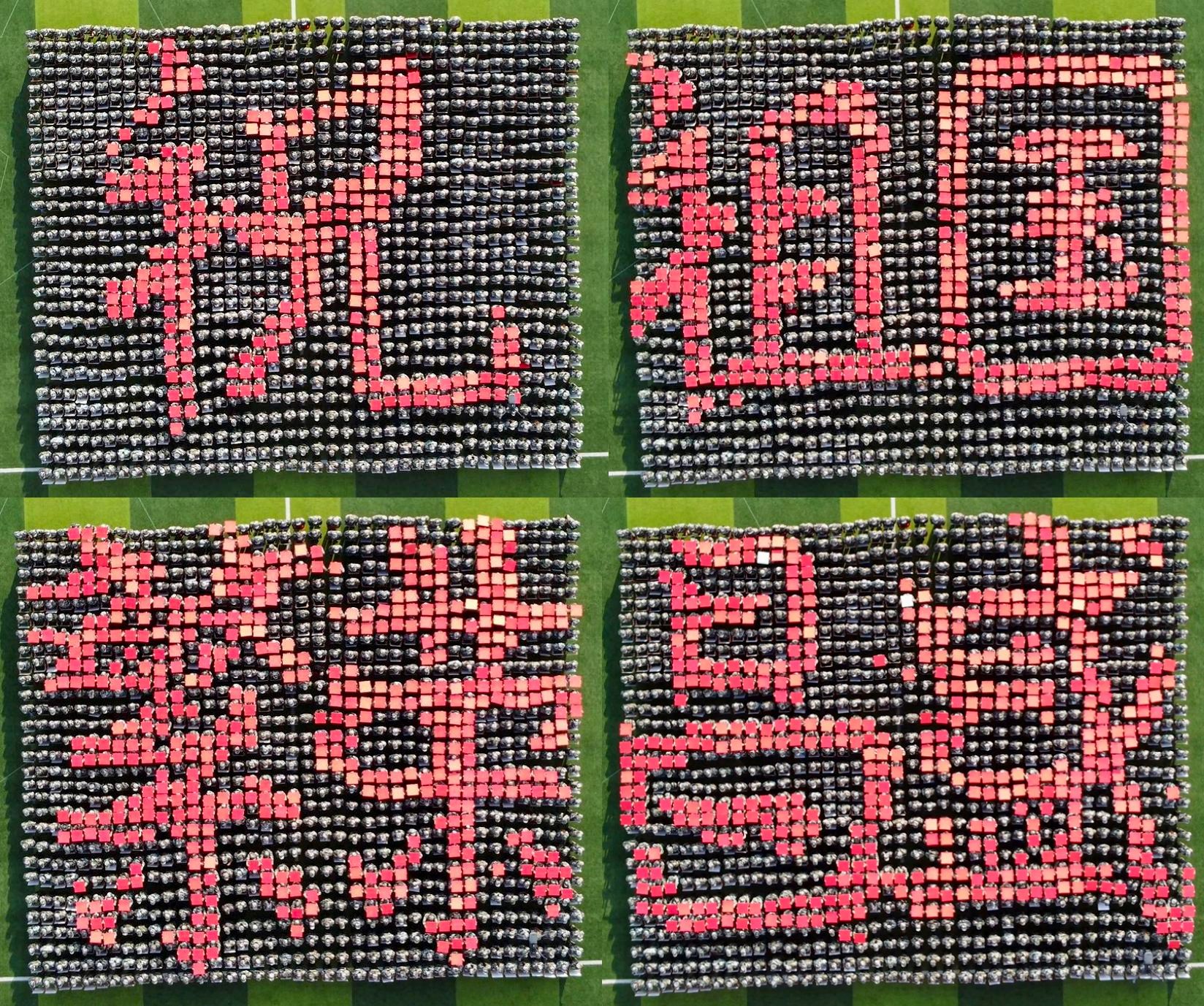 来自各个二级学院的同学们组成的字形方阵成为全场的焦点。他们用手中的红色卡牌拼凑出航母与四架飞机的形状缓缓入场,展现出非凡的默契。在国庆75周年到来之际,新生们用变换的数字和图案,诉说新中国成立前后的奋斗故事,“祝祖国繁荣昌盛、国泰民安”红色与白色的字块默契配合,拼凑出对祖国母亲最真挚的祝福,引得现场热情高涨,掌声经久不息……