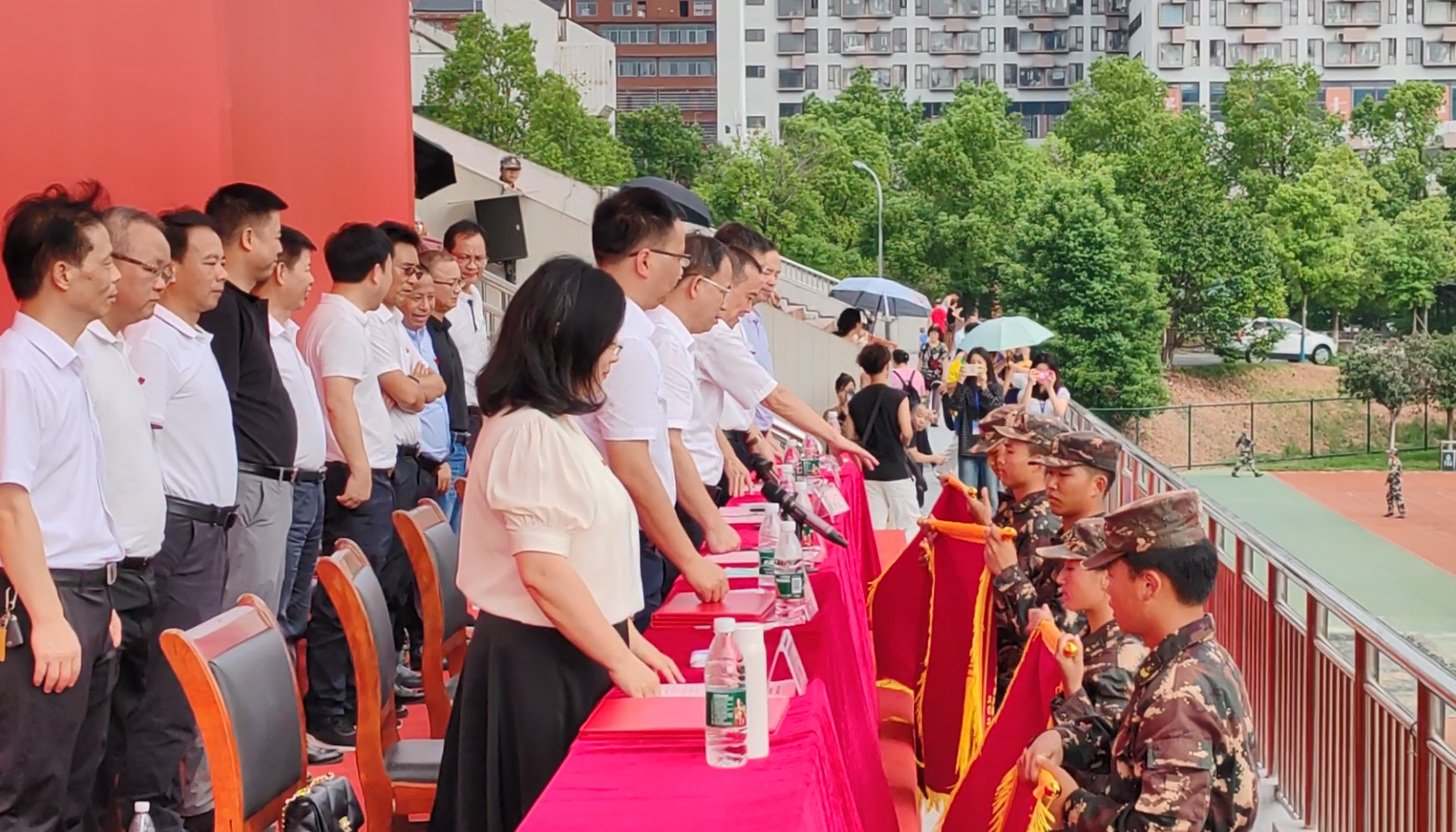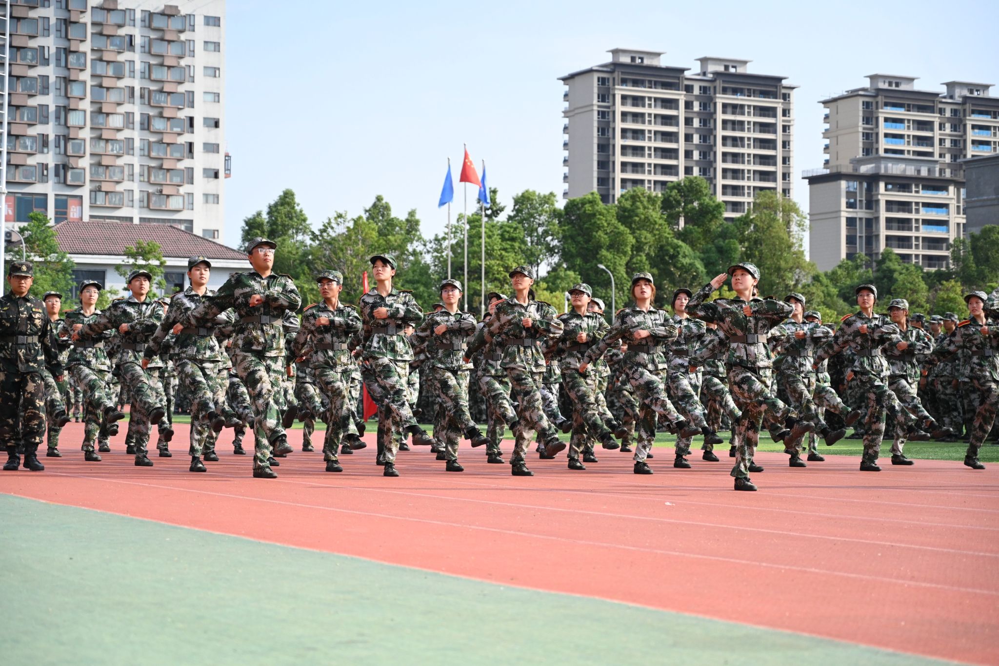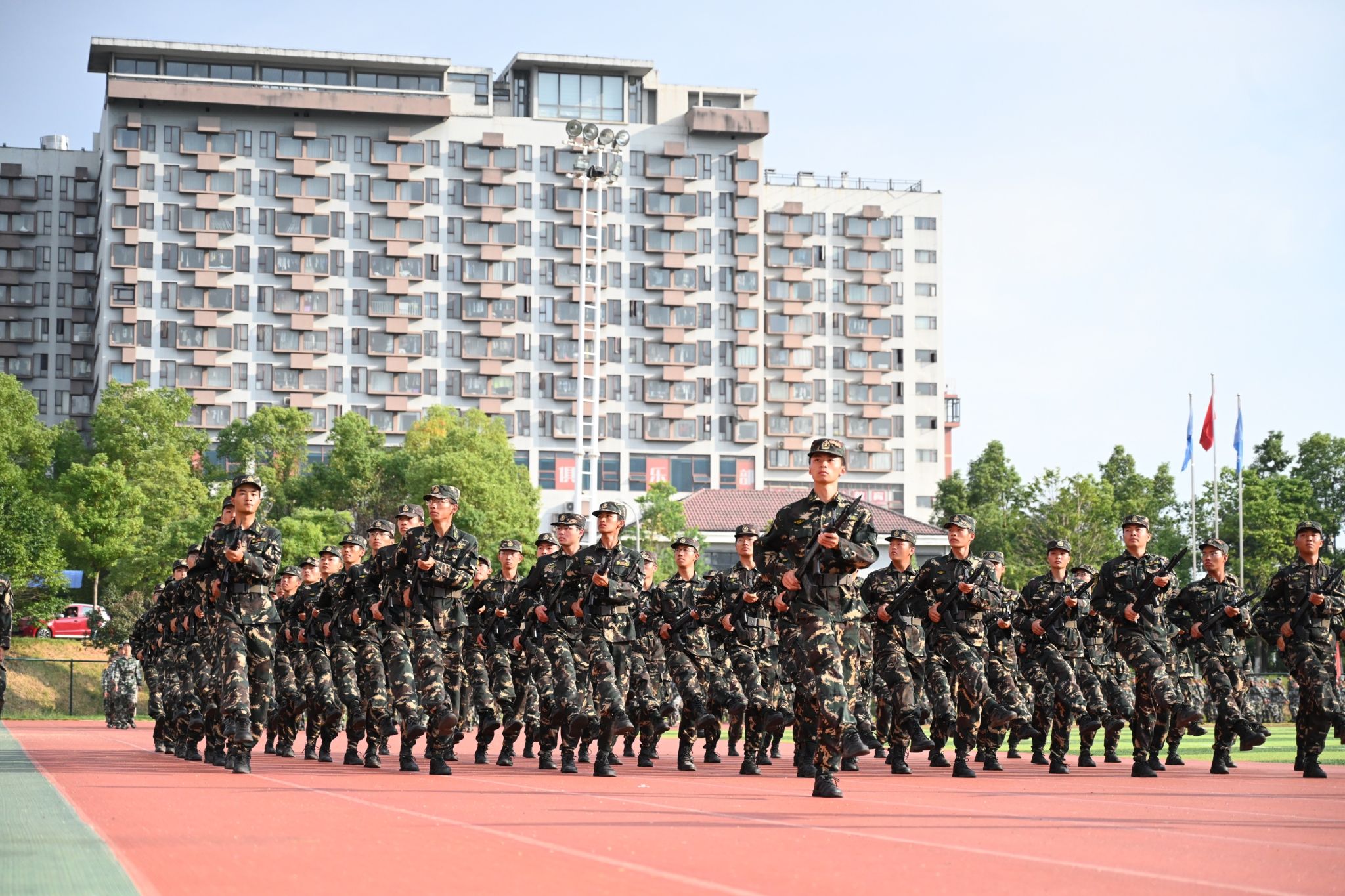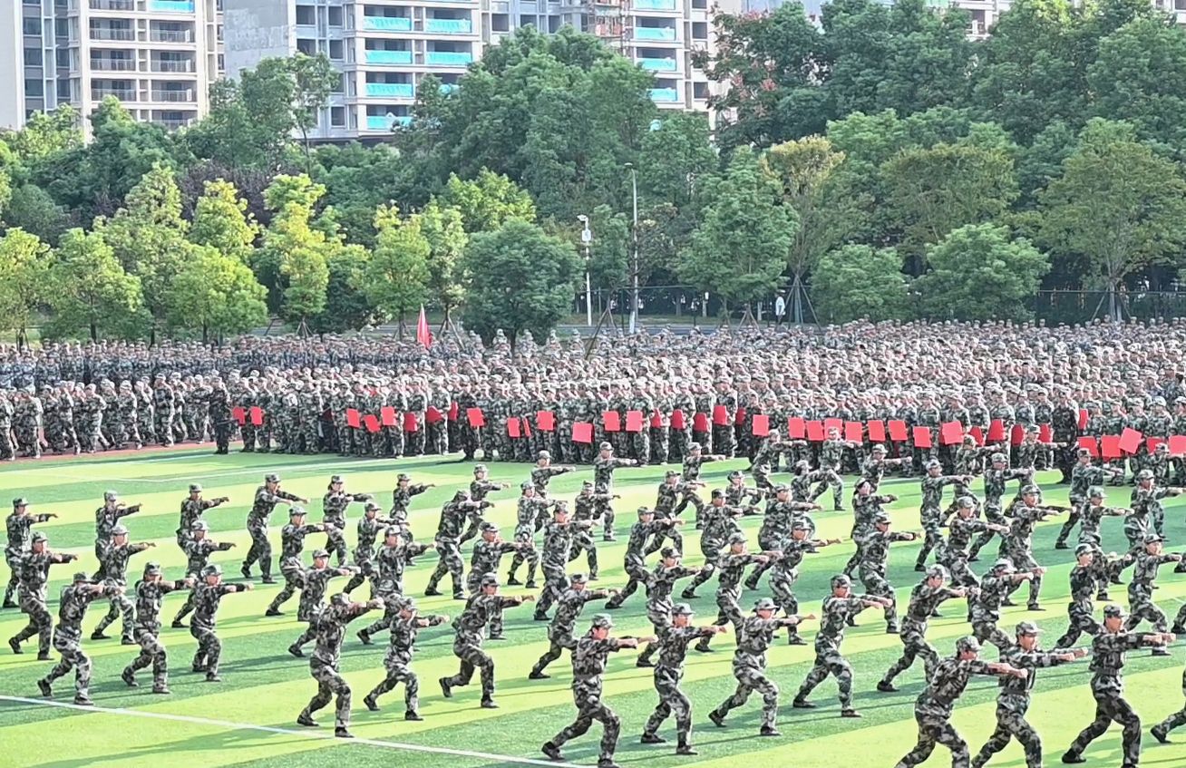 分列式进行曲响彻全场,教官分队持枪入场,眼神坚毅。他们以豪迈的激情斗志、过硬的军事素养向全校师生展现昂扬奋发、勇敢坚毅的精神风貌和青春风采。十四个二级学院方阵紧随其后,身着戎装的新生喊着铿锵有力的口号,迈着整齐矫健的步伐,向全校师生展示军训成果,接受全场的检阅。