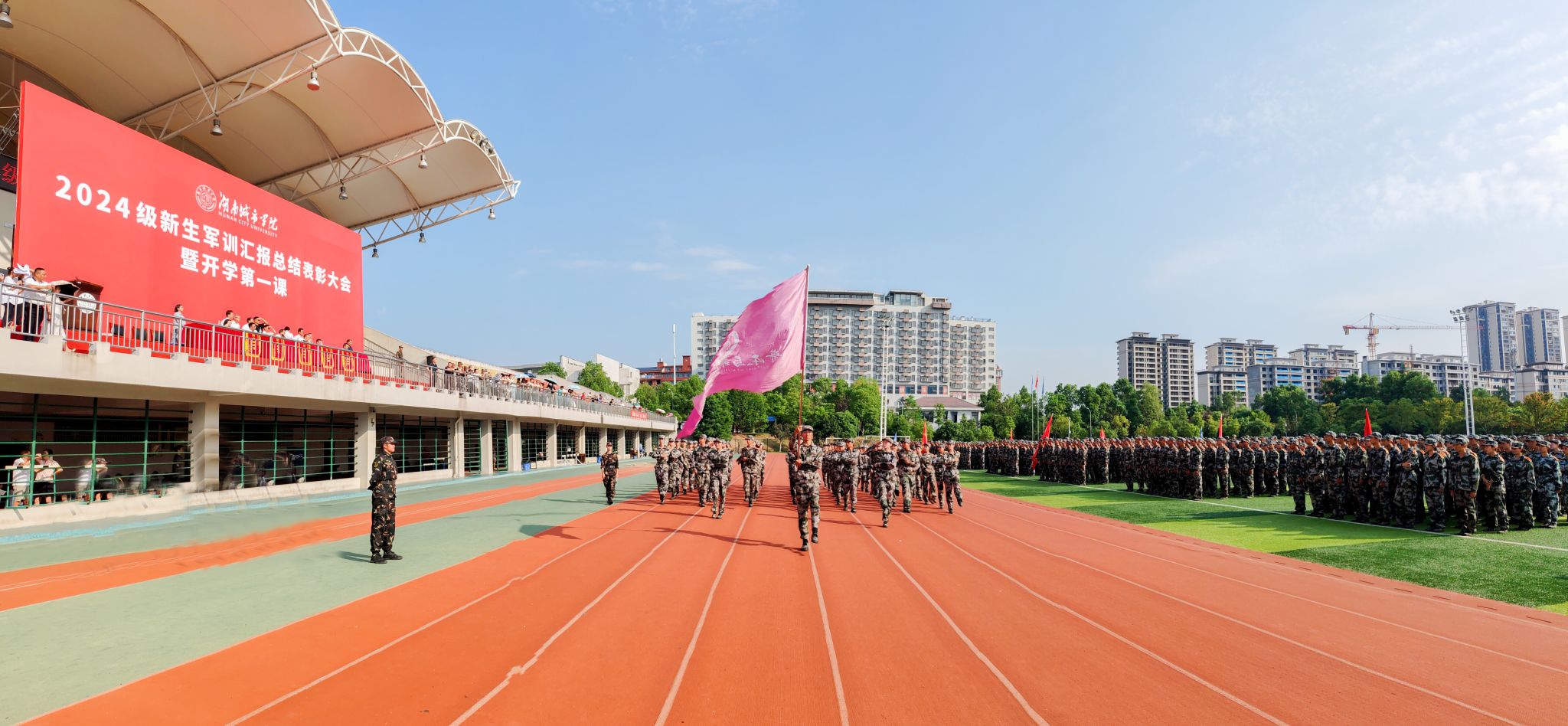 汇报表演结束后,校党委副书记袁志成作军训总结报告。他代表学校向参加军训的全体同学表示慰问,向参与本次军训工作的教官和老师们致以诚挚的感谢。他指出,希望新生能以这次军训为新的起点,把在军训中形成的雷厉风行、艰苦奋斗、积极进取、团结合作的良好作风融入到今后的学习、工作和生活中,专心致志,心无旁骛,沐光而行,同谱青春之歌,共筑城市之光,奋力书写属于你们的绚丽诗章。