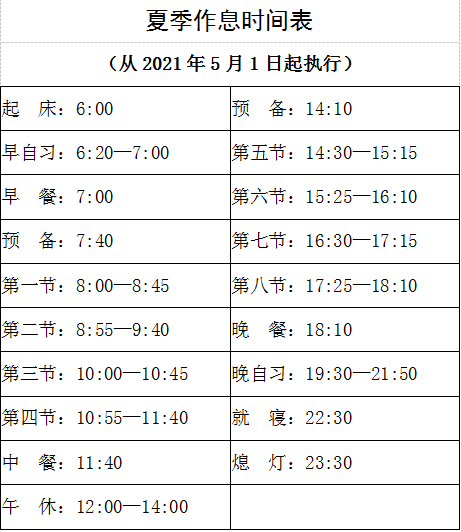 5月1日-5月5日放假调休,共5天。4月25日、5月8日上班。4月25日(星期日)上5月4日(星期二)的课、5月8日(星期六)上5月5日(星期三)的课。5月1日起执行夏季作息时间。