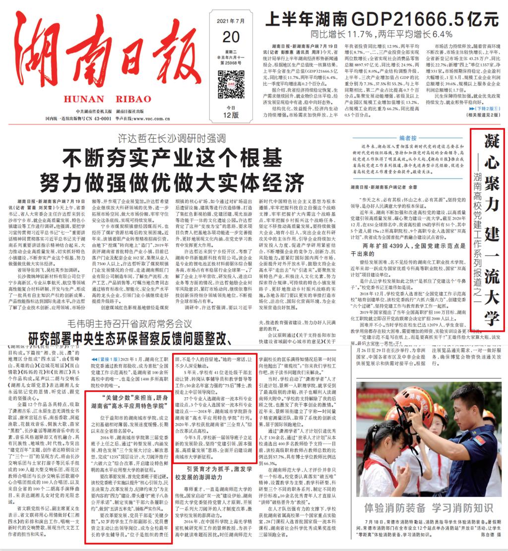 《湖南日报》7月20日头版报道我校以高质量党建引领高质量发展,凝心聚力建设一流大学。