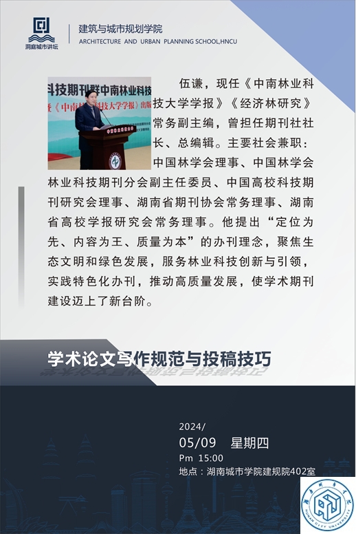 本网讯(通讯员 尚玉涛)2024年5月9日下午,我校邀请中国林学会理事、中国林学会林业科技期刊分会副主任委员、中国高校科技期刊研究会理事、湖南省期刊协会常务理事、湖南省高校学报研究会常务理事、《中南林业科技大学学报》《经济林研究》常务副主编伍谦,为我校研究生作“学术论文写作规范与投稿技巧”的学术讲座。