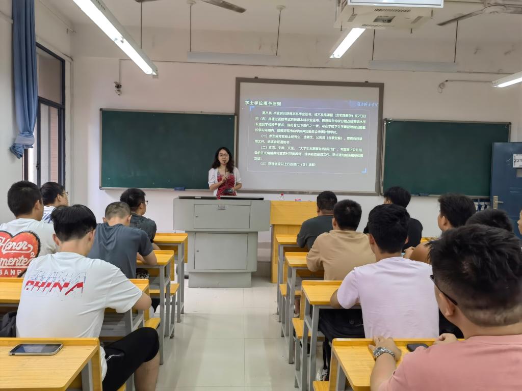 学工办主任周文萍老师带领同学们学习了学生手册的相关内容,希望同学们严格遵守学校的各项规章制度,尽快找到自己的发展方向和定位,在学好理论知识的基础上,积极参加校院各类组织活动,努力提升自身综合能力。