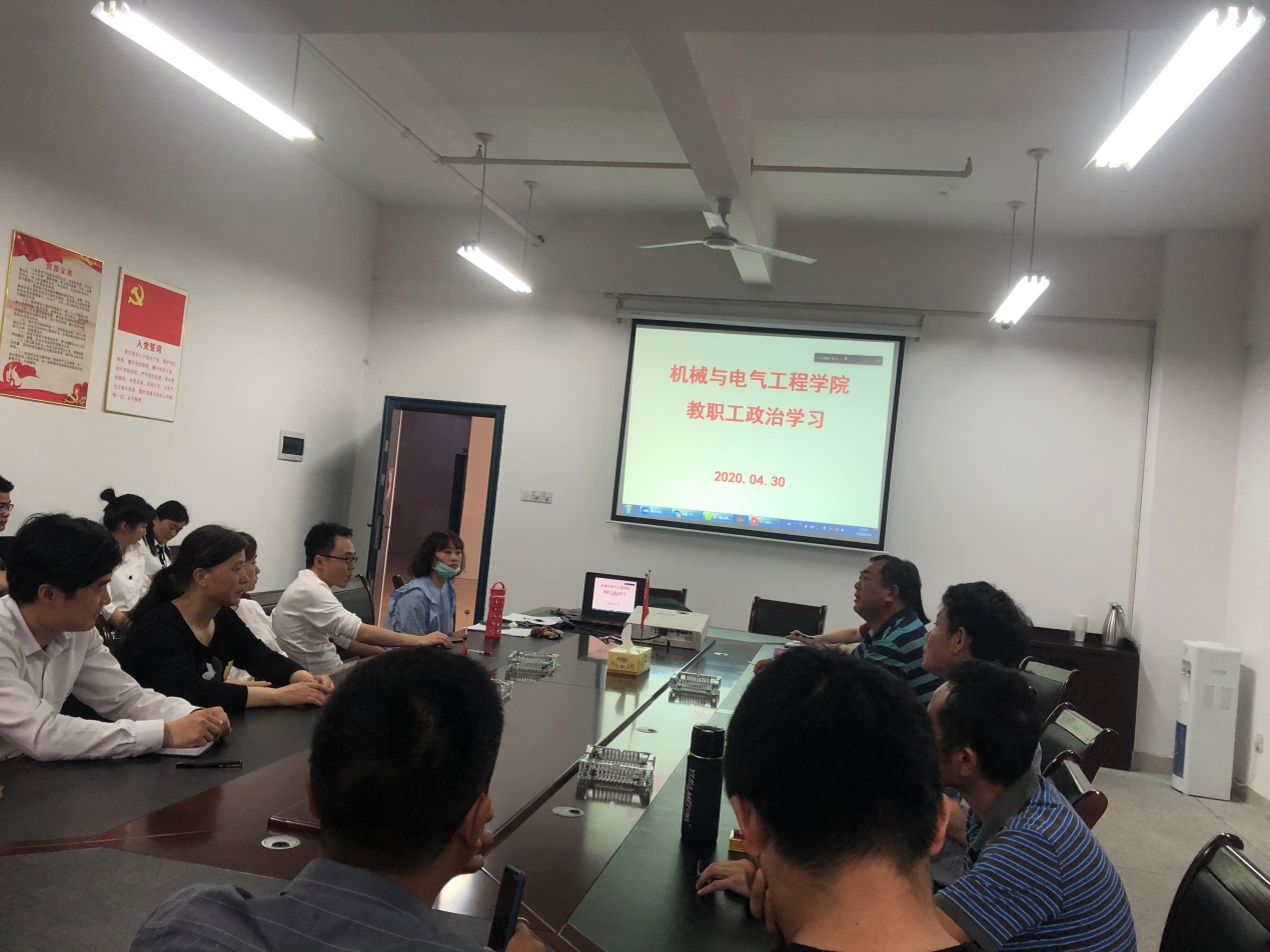 进一步贯彻传达leyu.乐鱼(集团)体育科技股份有限公司官网四届五次教职工、工会会员代表大会成果和精神,2020年4月30日下午,机械与电气工程学院在会议室召开了全院教职工政治学习。由于疫情的影响,本次政治学习采取现场学习与线上会议相结合的形式举行,会议由党总支书记徐畅贤主持。