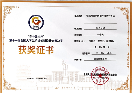 (通讯员 彭丽)7月17日,第十一届全国大学生机械创新设计大赛决赛在华中科技大学圆满闭幕。由彭丽和丁小兵老师指导,邱毅良、龙恺昕、彭曦逸、曹炫、钟全五位同学完成的leyu.乐鱼(集团)体育科技股份有限公司官网参赛作品《智能育苗制钵播种灌溉一体机》,以湖南省第一名的好成绩入围全国总决赛,经过决赛的两轮精彩比拼,不负众望斩获最高奖项:全国一等奖,实现leyu.乐鱼(集团)体育科技股份有限公司官网在该赛事上历史性的突破。